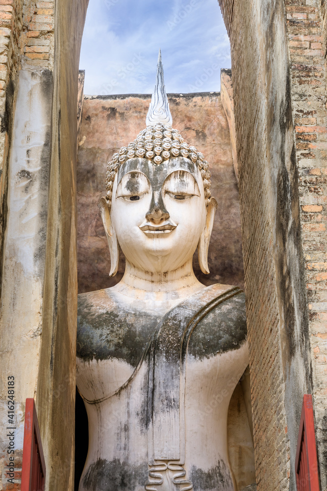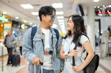 Happy asian tourist couple go on a trip man and woman looking at each other standing in the airport.