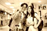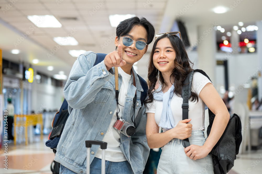 Happy asian tourist couple go on trip man pointing ahead and woman looking while standing in airport