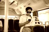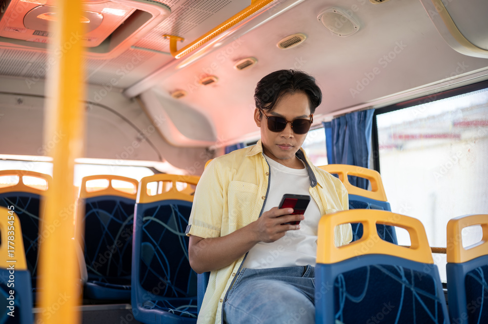Asian man tourist wears shades holding looking at phone and sitting in shuttle bus while go on trip.