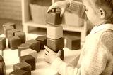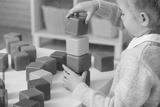 Cute little girl playing with plastic cubes at table in children's room, closeup