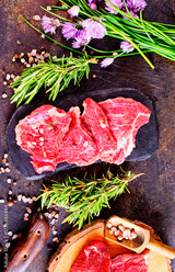A piece of beef with spices and rosemary on a dark background