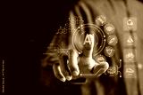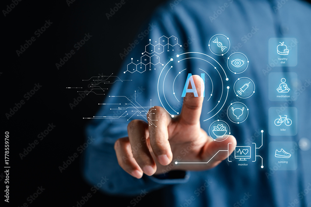 Artificial intelligence for healthcare and wellness innovation. AI interface with medical, fitness, and healthy lifestyle icons. Smart digital technology for health monitoring.