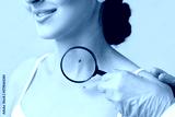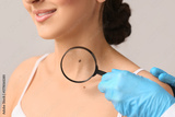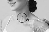 Dermatologist with magnifying glass examining moles of young woman on white background, closeup