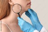 Dermatologist with magnifying glass examining moles of young woman on white background, closeup