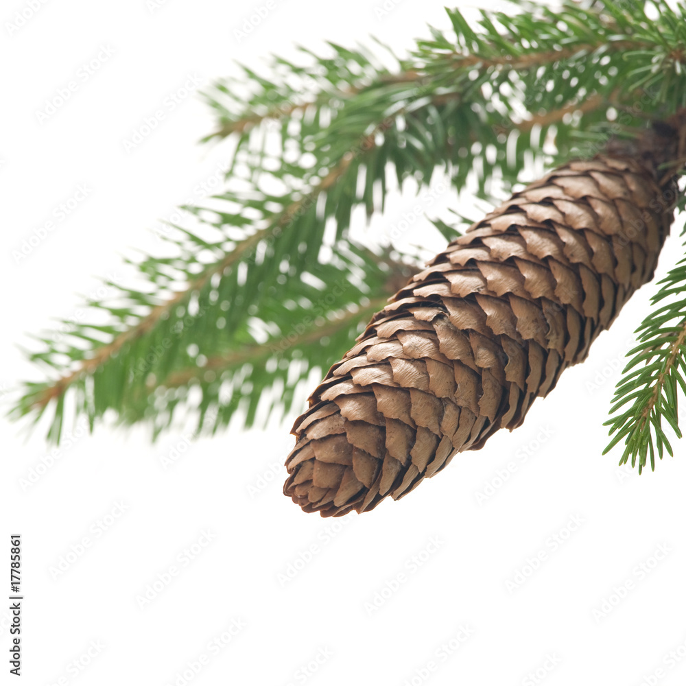 Fir cone and branch on a white background
