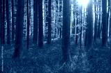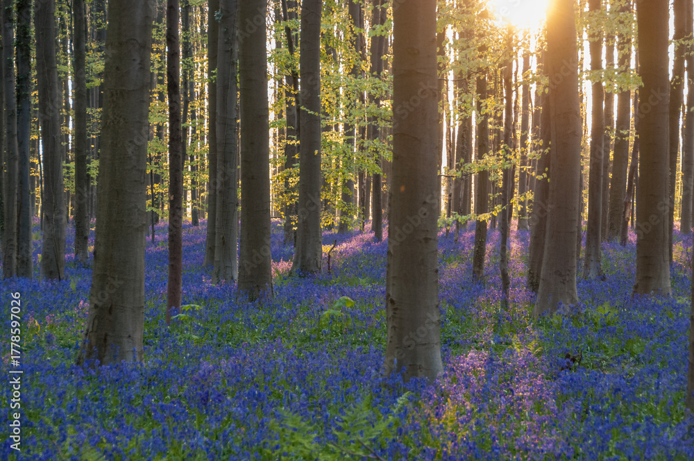 The rising sun illumingating a flowerbed of bluebells in the Hallerbos, on an early spring morning.
