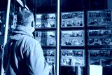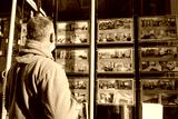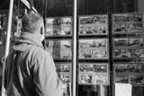 Man browsing property listings in a real estate window display in the city during the afternoon
