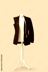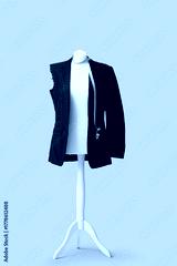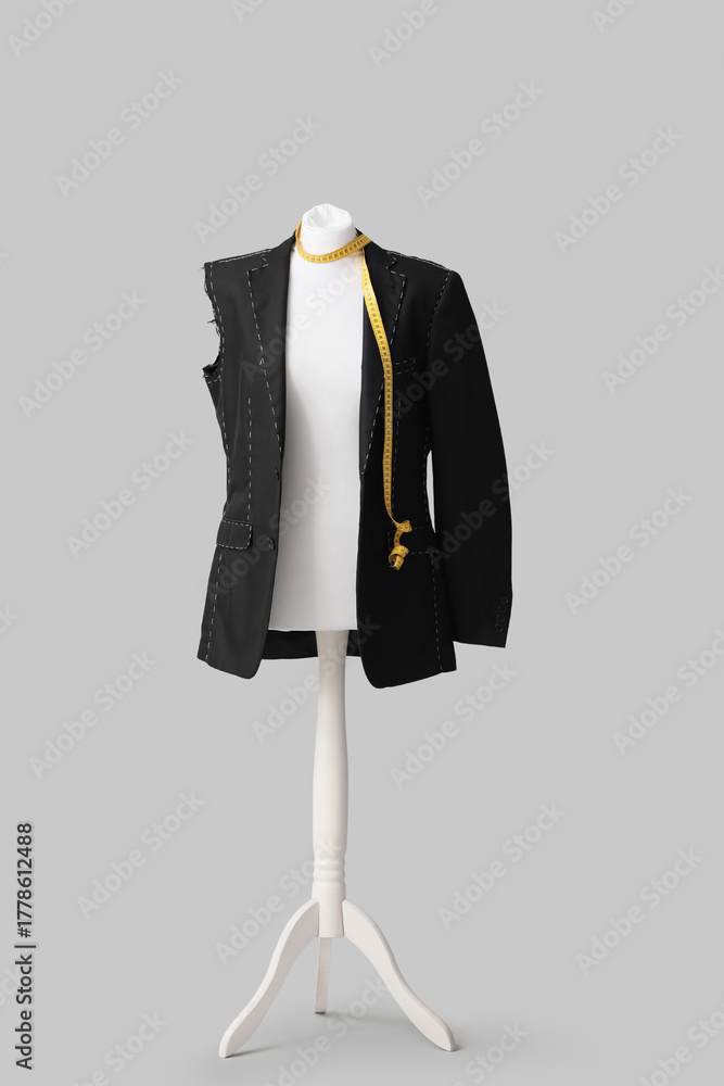 Mannequin for tailor with half-finished jacket and measuring tape on white background
