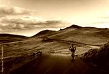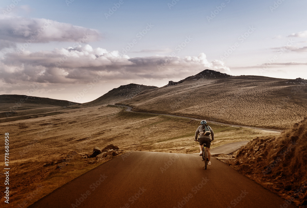 Lone Biker on the Road Through Mountains