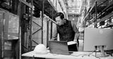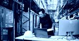 Man, documents and stress at warehouse with laptop, checklist or lost invoice for shipping order. Person, computer and paperwork for supply chain, notes and search with inventory management at plant