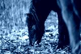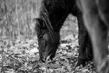 Artistic close-up of a dark horse pony head and mane backlit by intense sunlight, with soft lens flare and a dreamy, overexposed sky creating a peaceful and ethereal atmosphere