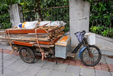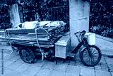 Chinese Three Wheeled Delivery Bicycle. An old Chinese cargo tricycle used for deliveries with pedals and electric motor, Shanghai, China