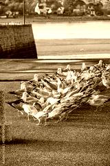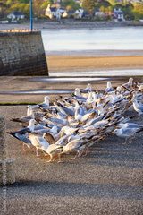 Flock of gulls foraging on a pier at the coast