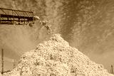 Pile of white cotton is being loaded onto a conveyor belt. The pile is very high and the conveyor belt is moving the cotton.