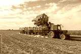 Cotton harvesting. Unloading the harvested cotton from the combine onto a tractor trailer for transportation.