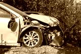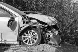 A white car lies in a pile of mud and rocks after an accident. The front end is smashed.