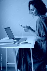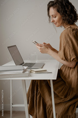 Woman in Boho Dress Holding Smartphone While Sitting, Calm and Minimal Workspace