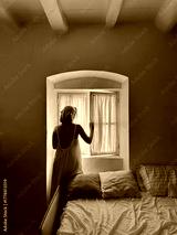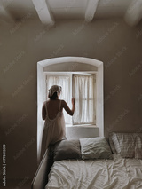 Woman looking out the window in natural light mood