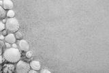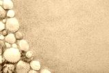 Different beautiful sea shells on light brown sand background. Closeup. Empty place for text. Top down view.