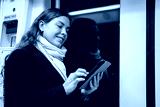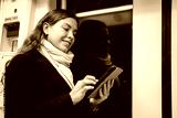 Engaged female passenger happily reading on a tablet device while commuting on public transport. She is immersed in her e-reader, showcasing a moment of concentration during her journey on the subway.