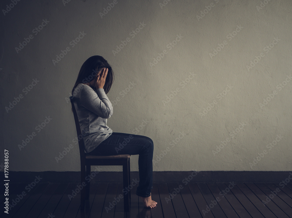 Depressed woman sitting on a chair in dark room at home. Lonly , sad, emotion concept.