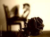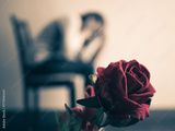 Retro sad woman sitting and crying with red rose in focus. Lonly , love, emotion concept.