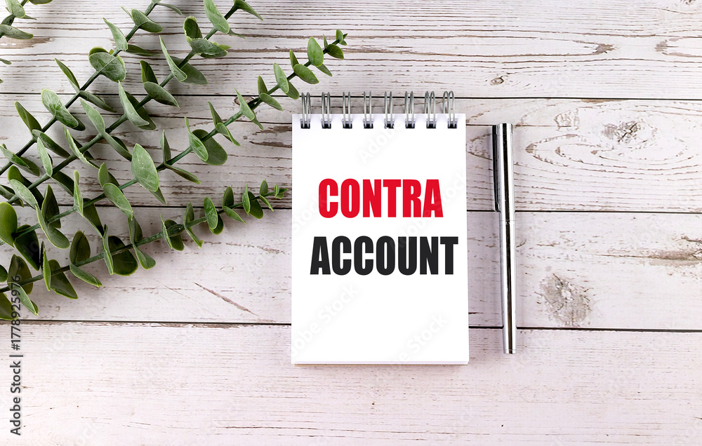 Contra account written on spiral notebook with silver pen and green leaves on wooden background