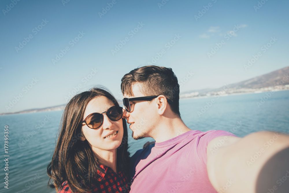 Loving couple taking selfie on background of sea