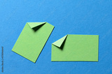 Green paper message notes or sheets with folded edge dog-ear earmark and copy space for text on blue background, top view flat lay conceptual desk backdrop