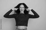 Young stylish woman covers ears with fingers against a bright yellow background wearing a burgundy sweater posing for a fashion lifestyle stock photo
