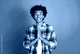 Young man with plaid shirt smiles with hands in prayer pose against blue background
