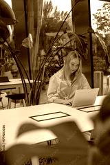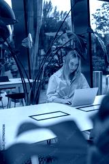 Gen Z freelancer with laptop working in a green coworking space among indoor plants, biophilic design; remote work, focus, productivity, flexible schedule, sustainable work lifestyle.