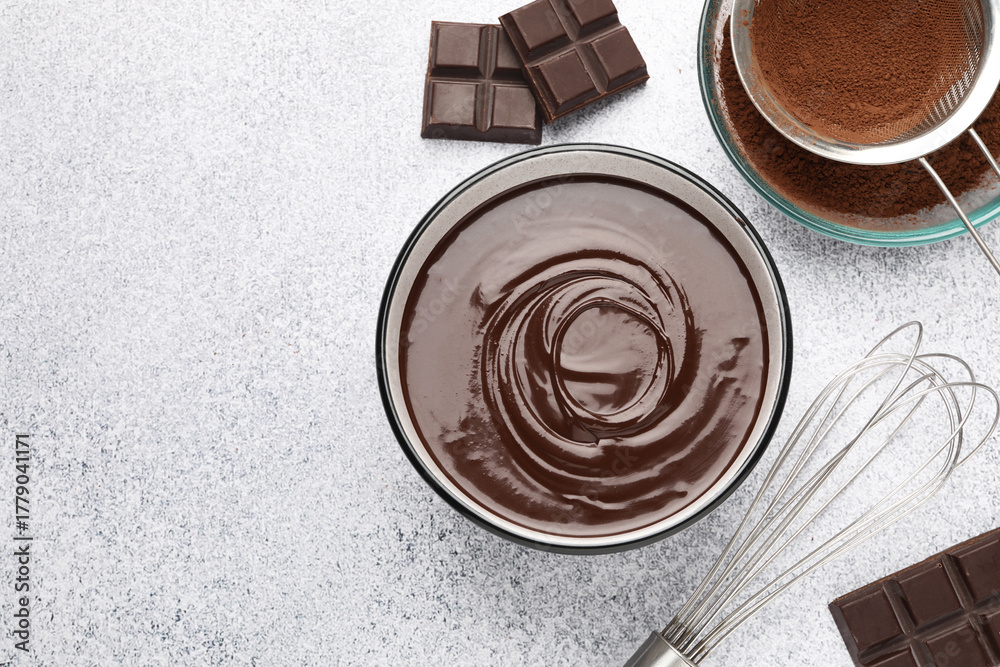 Melted chocolate in bowl, pieces, cocoa powder and whisk on light grey table, flat lay. Space for text