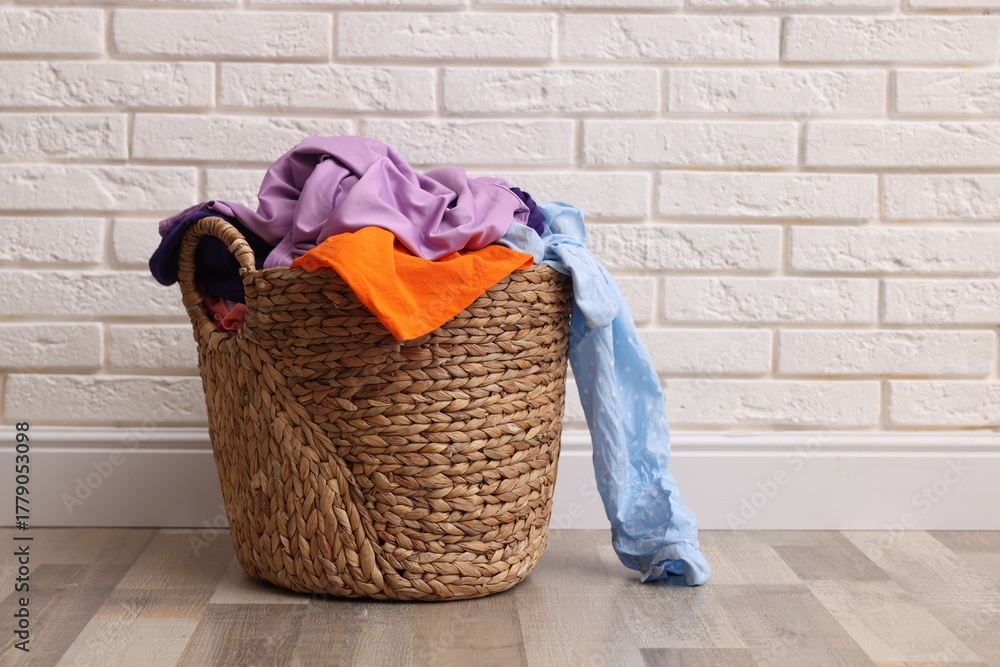 Laundry basket full of clothes on floor near white brick wall indoors. Space for text