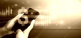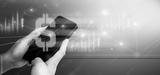 hand of businessman interactive touching a holographic system network and technology, sci-fi cyberpunk hud
