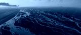 Braided silvery rivers fan across a black sandur near Vik, Iceland, in evening summer light. Channels snake over volcanic ash, framed by green farms and long shadows.