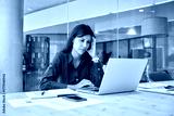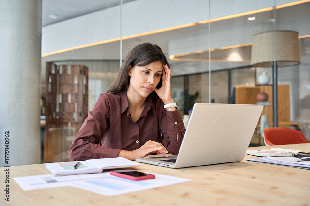 Confused young trader businesswoman looking disappointed at laptop pc computer screen having stress. Tired European business woman holding hand near temples, feeling stressed in office. Copy space