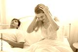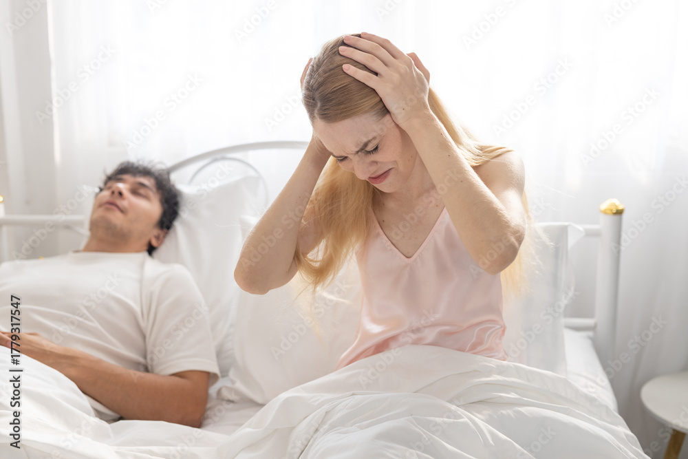 Frustrated young women sitting in bed with hands on head, stressed and emotional while man sleeps beside her, showing relationship tension and mental health struggle in morning light.