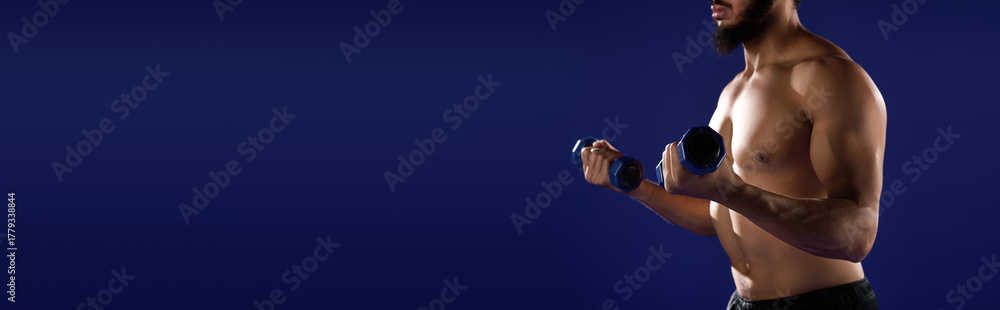 Sportive African American man lifts weights against a vibrant blue backdrop