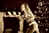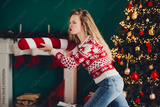 Playful woman in festive sweater aims at giant candy cane pillow beside a twinkling Christmas tree during joyful holiday moments