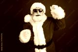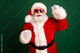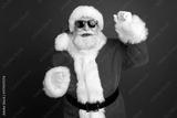 Santa in red suit with white fur trimming wearing red sunglass celebrates Christmas for festive advertising and family celebration