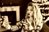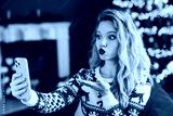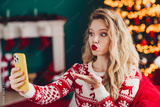 Playful Christmas selfie moment with a blonde woman in a cozy sweater by the Christmas tree at home and holiday lights
