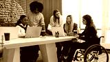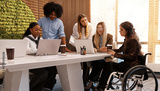 Inclusive diverse business team meeting with woman using wheelchair at modern office