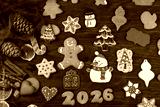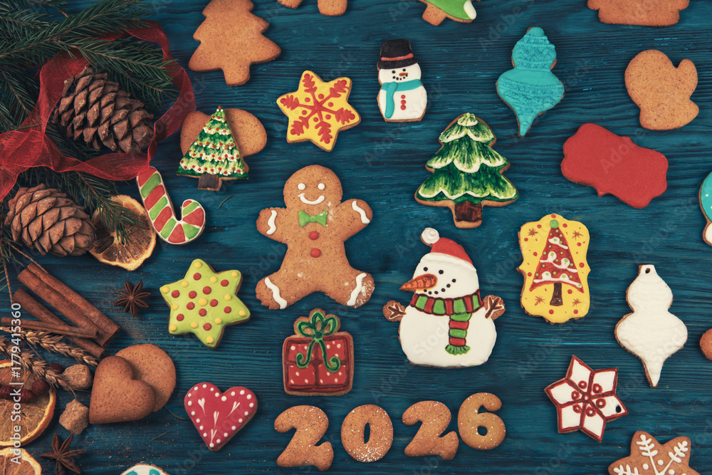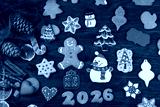 Colorful Christmas cookies shaped like snowmen, trees, stars, and gingerbread surround the text Merry Christmas 2026 on a wooden background.