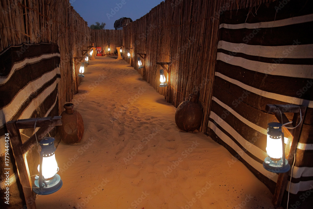 Arabian traditional tent in the middle of the desert for a family gathering in Dubai, United Arab Emirates, with Arab heritage.