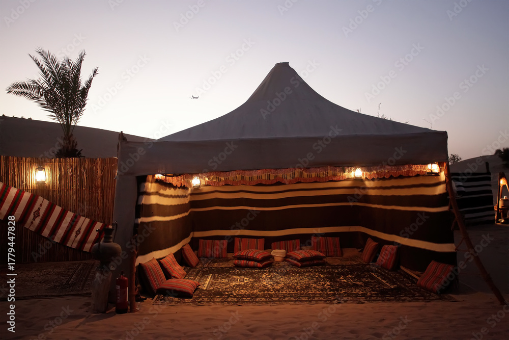 Arabian traditional tent in the middle of the desert for a family gathering in Dubai, United Arab Emirates, with Arab heritage.