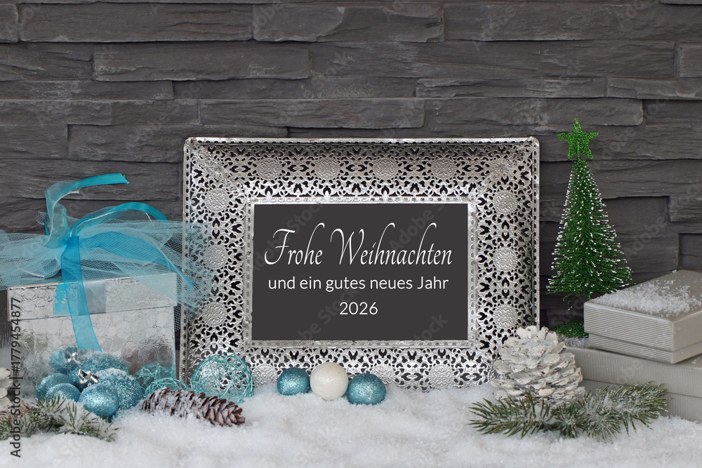 Winterliche Kulisse mit Geschenken und Weihnachtsschmuck im Schnee auf einem Rahmen steht der Text frohe Weihnachten und ein gutes neues Jahr.