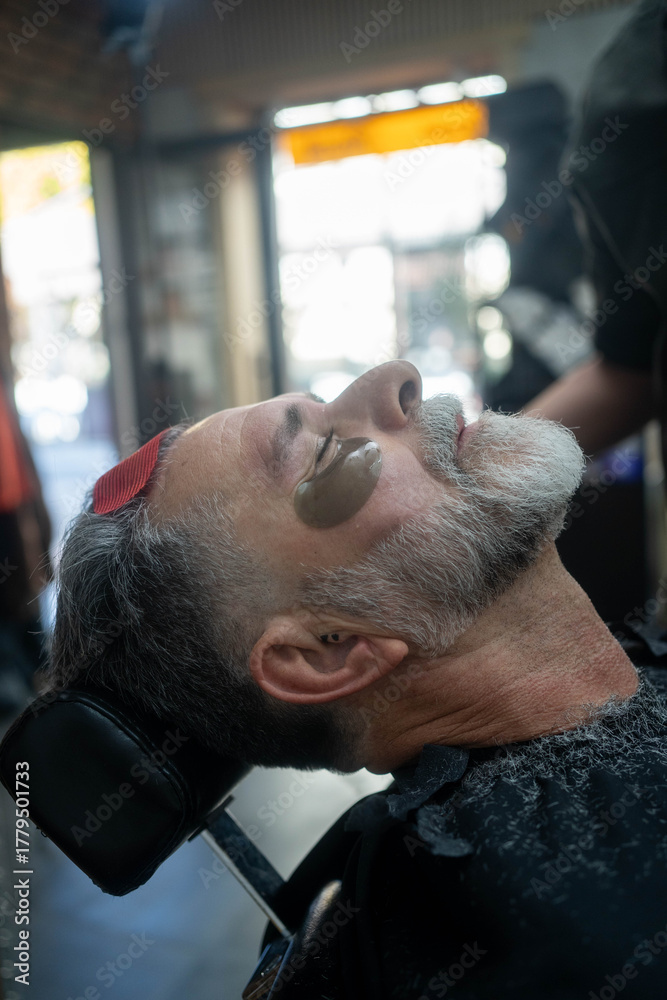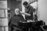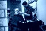 Hairstylist cutting and styling hair of client in modern barber shop.