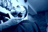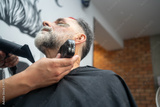 Barber using clipper to cut and style beard of mature client in modern barbershop small business