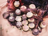 A collection of delicate macarons sits amongst scattered blossoms and soft, patterned paper. These tasty treats are decorated with fondant flowers in shades of lilac, pink, and white
